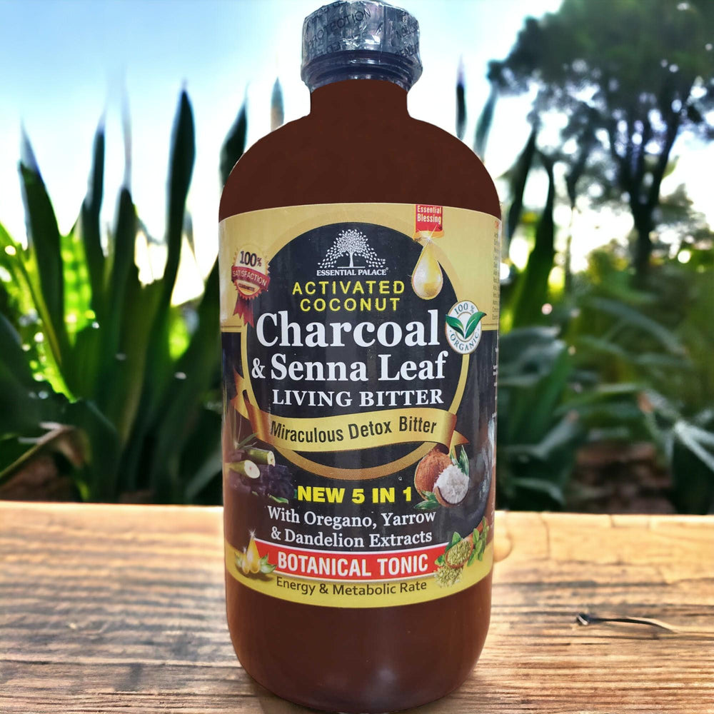 Essential Palace Activated Coconut Charcoal with Senna Leaf Living Bitters is Very Helpful to Wash Away Toxic Heavy Metals. Charcoal has been used for Centuries as a Natural & Powerful Detoxifier, & is still used in Western Medicine Today. This Power Full Detox Bitter is Packed with Highly Adsorbent Material with Millions of Tiny Pores that can Capture, Bind, & Remove Unwanted Materials When Suspected Food & Drink is Consumed. Toxins from Low Quality, Processed Food, & Environmental Pollution are a Real Problem. It is Important to help the Body Eliminate them to Promote a Healthy Digestive System & Brain. Chronic Exposure to Toxins Produces Cellular Damage, Allergic Reactions, Compromised Immunity, & More Rapid Aging.