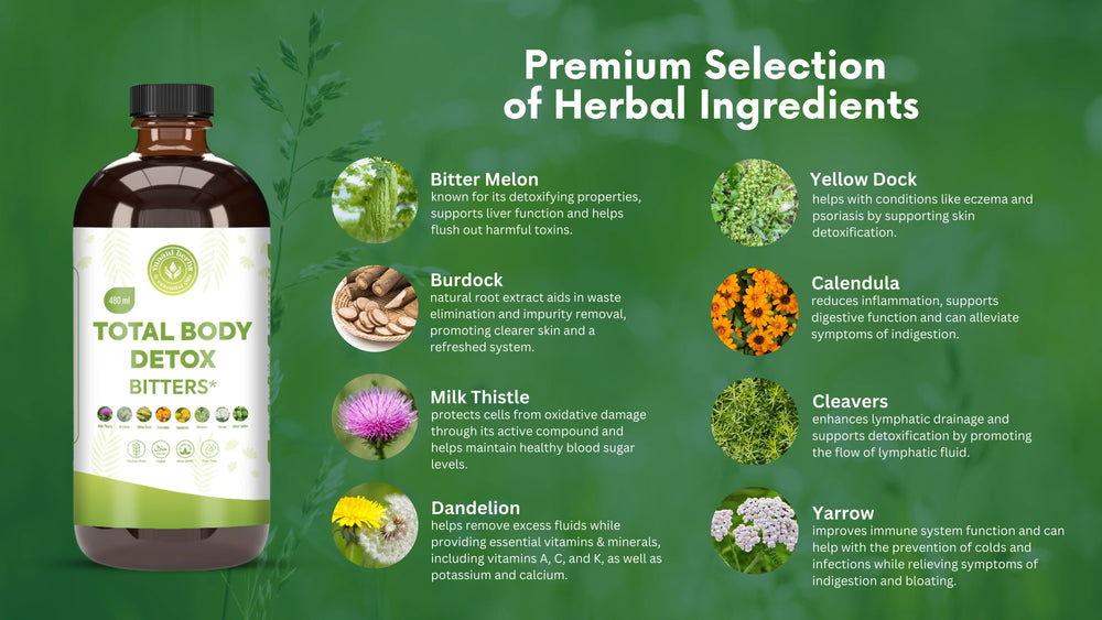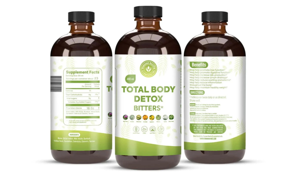 Experience a total body detox with Total Body Detox 480ml, crafted with a blend of Yunani herbs including milk thistle, burdock, and calendula.